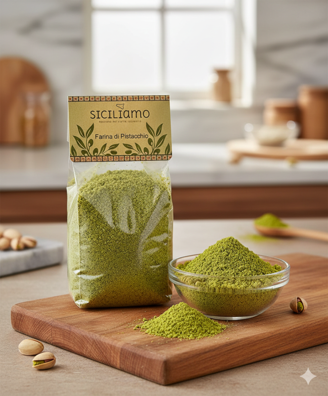 La Farina di Pistacchio 500 g è una polvere finissima ottenuta dalla macinazione di pistacchi sgusciati e selezionati — un ingrediente versatile e aromatico per la tua cucina quotidiana e per le tue creazioni di pasticceria. Il suo caratteristico colore verde intenso e il sapore nutty e delicato la rendono ideale per dolci, biscotti, creme, gelati, pasta fatta in casa e piatti salati.